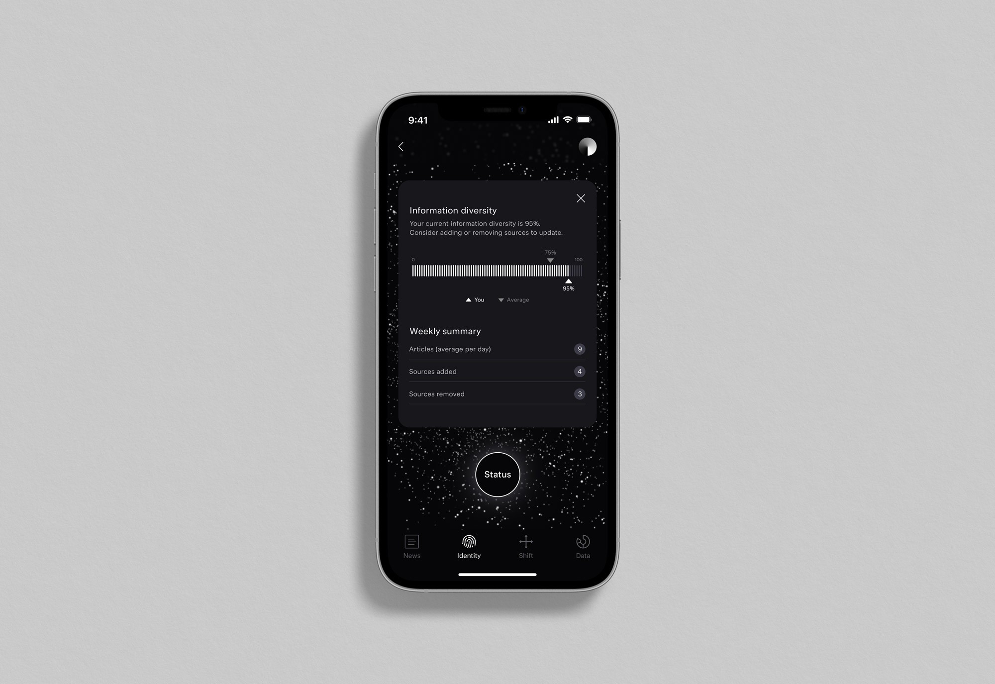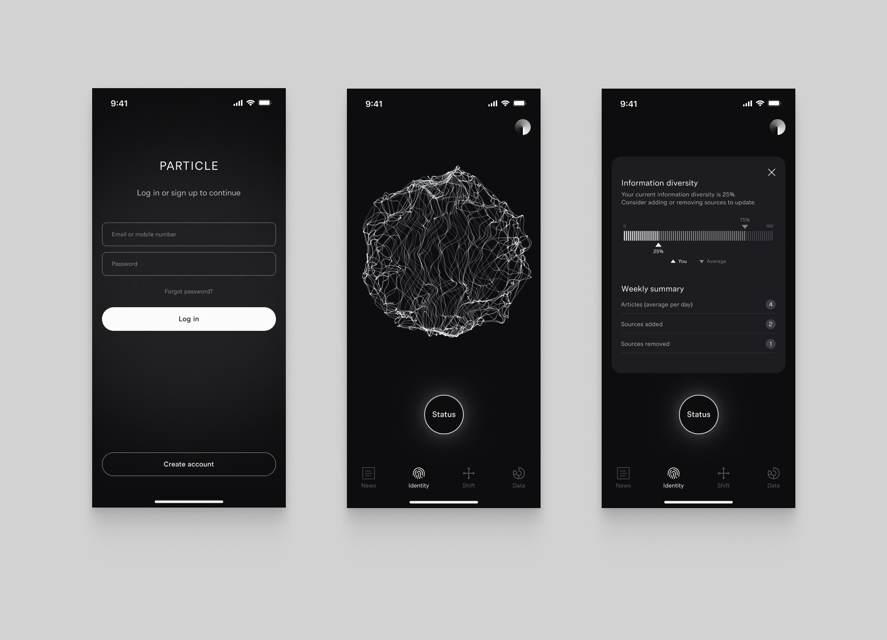 The interface is deliberately reductive—neutral in tone, stripped of branding, and designed to visualise, not editorialise. Users encounter a live portrait of their "Particle Identity"—a mapped landscape of bias, repetition, and ideological leanings.