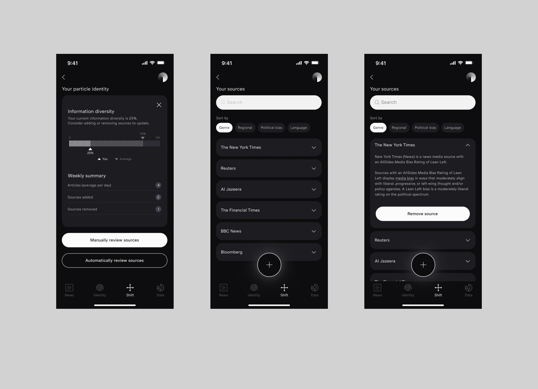 Particle draws on media studies, behavioural research, and case-based journalism to investigate how belief systems are shaped by the platforms we rely on. From the radicalisation arc of Caleb Cain to findings from the Pew Research Center, these insights informed a tool that acts as both critique and intervention—helping users recognise patterns in their media exposure and challenge their own informational boundaries.